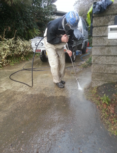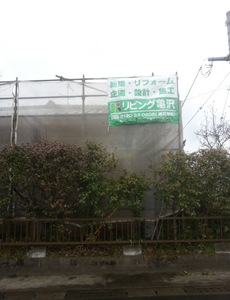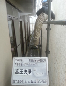 | まずは足場を組み立てます。 | 高圧洗浄によってコケや落ち葉など、汚れを落としていきます。 | 外壁も同様に汚れを落とします。 |