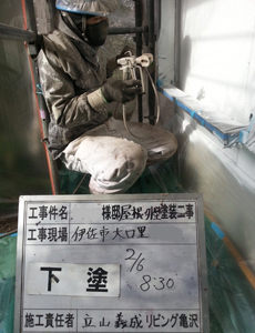 | 汚れを取り除いたら下塗りを行います。 | 下塗りが完了しました。 | 次に中塗りを行います。 |