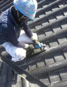 | 磨いてムラなどを無くします。 | 瓦には白い汚れがびっしりとついています。 | 白い汚れを取り除いていきます。 |