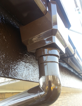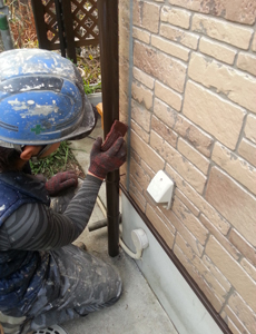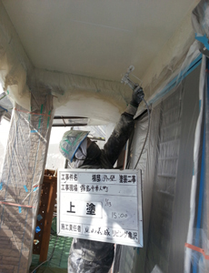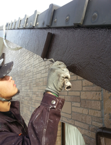 | 軒天も隅までしっかりと塗装していきます。 | 破風板も塗装していきます。 | 雨樋も丁寧に塗装し、磨き上げてピカピカにします。 |