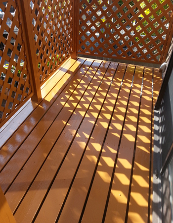 | 雨樋も磨きをかけ、反射した景色が映るほど綺麗になりました。 | 外壁を綺麗にするのと一緒にデッキも塗装しました。 |