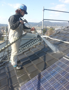 | まずは足場を組み立てます。 | 高圧洗浄で屋根の汚れを落とします。 | 丁寧に養生していきます。 |