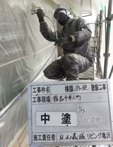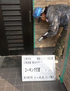 | コーキング打ち替えです。 | ヘラで均していきます。 | 中塗りをしていきます。 |